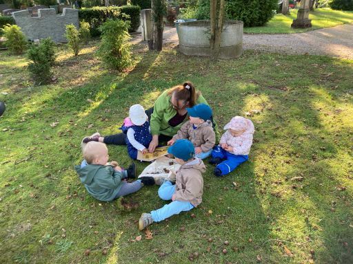 Bei strahlendem Herbstwetter begeben wir uns auf eine Entdeckungstour, um auf unserer Mooswiese Eicheln, Blätter, Stöcke, Moos und andere natürliche Schätze zu sammeln. Gemeinsam gestalten die Kinder dann ein Bild auf vorbereiteter Pappe, das die Schönheit des Herbstes festhält und dabei ihre Feinmotorik trainiert.